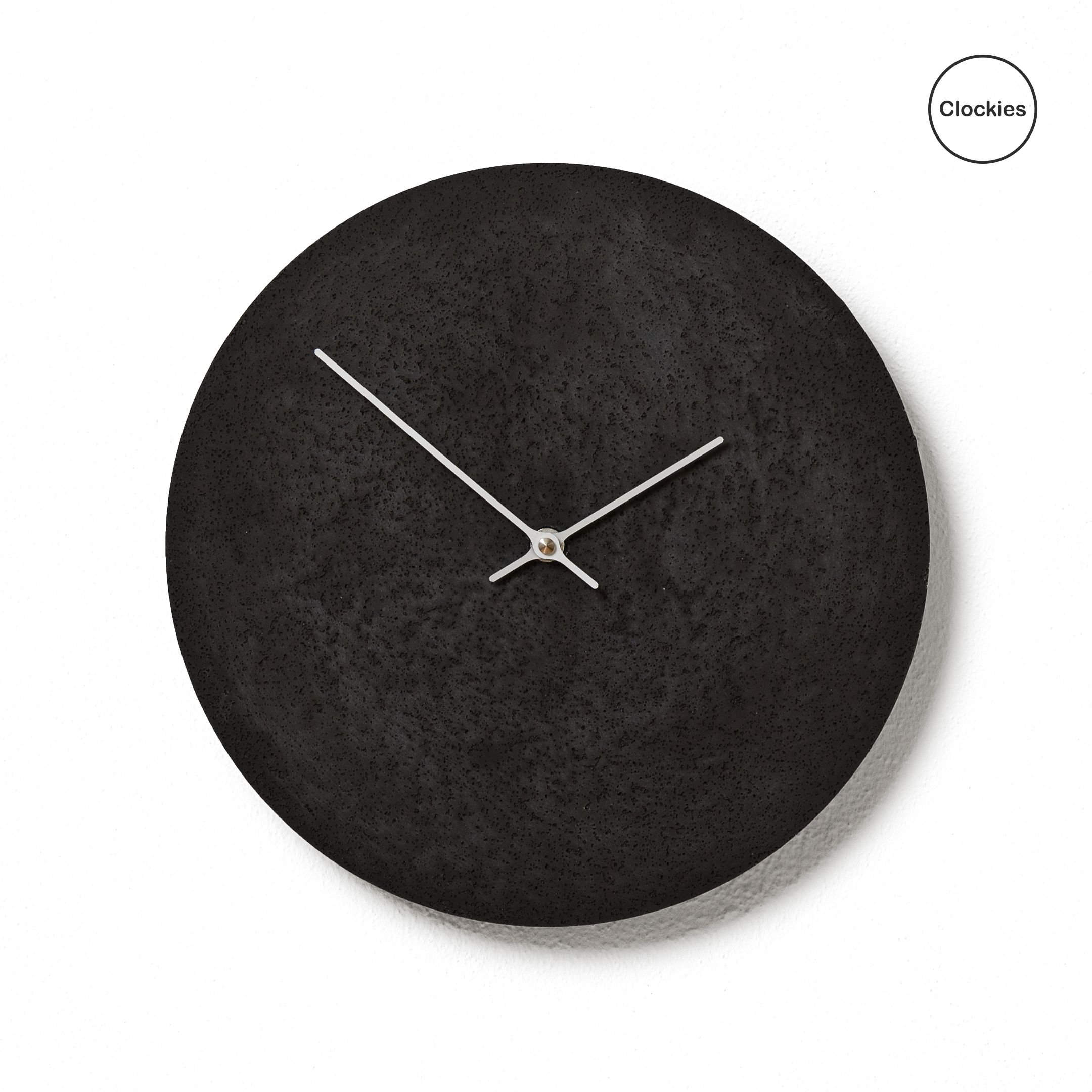Antracitové nástěnné hodiny ve tvaru kruhu s dřevěnými rafičkami z břízy.