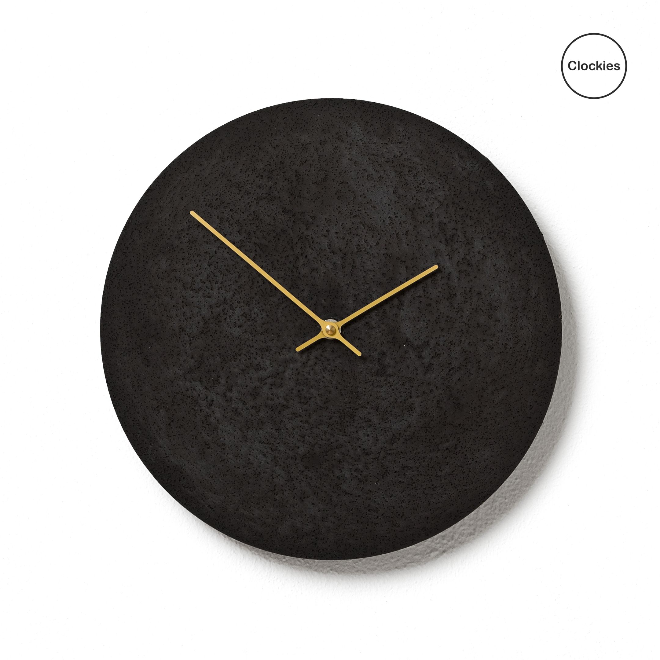 Antracitové nástěnné hodiny ve tvaru kruhu se zlatými rafičkami z eloxovaného hliníku.