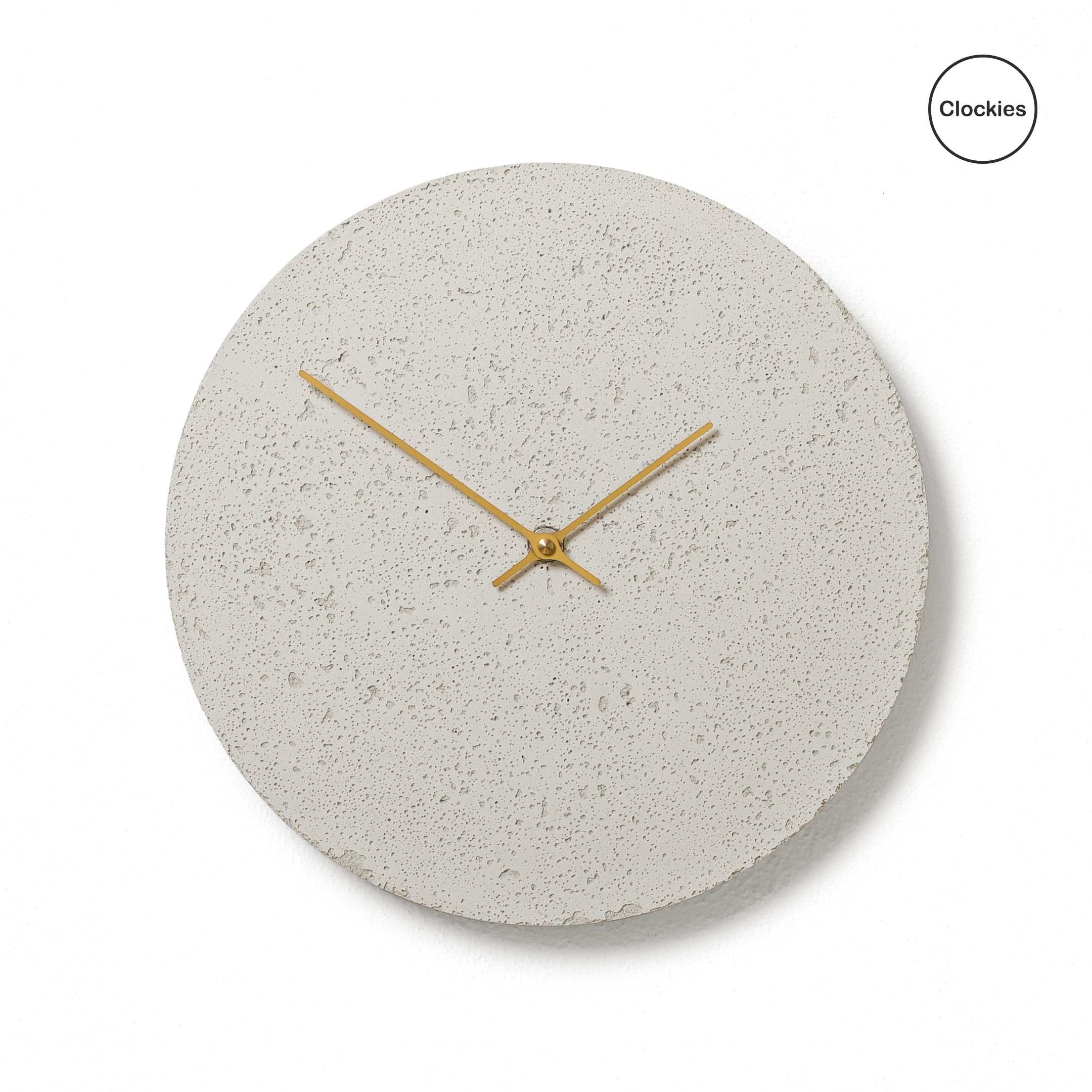 Břidlicové nástěnné hodiny ve tvaru kruhu se zlatými rafičkami z eloxovaného hliníku.