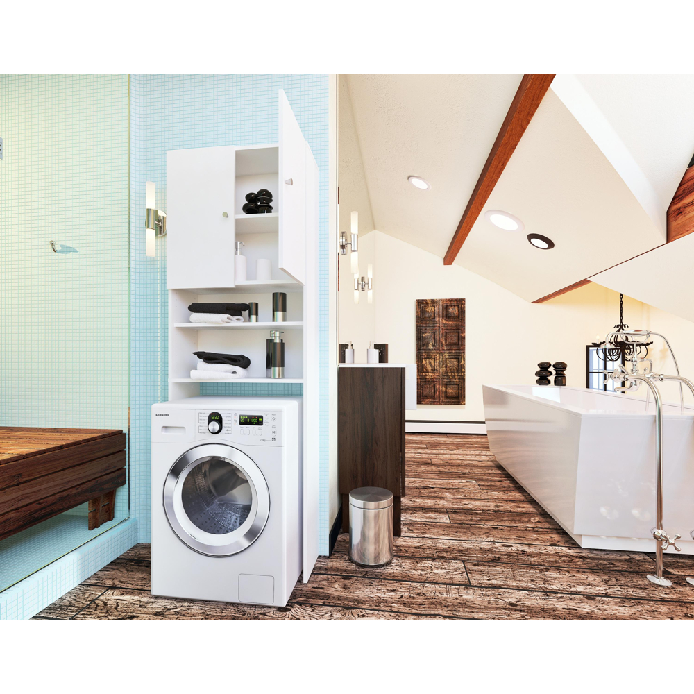 Skříňka na pračku v bílé barvě, se 2 otočnými dveřmi a 2 otevřenými přihrádkami nad pračkou. Skří...