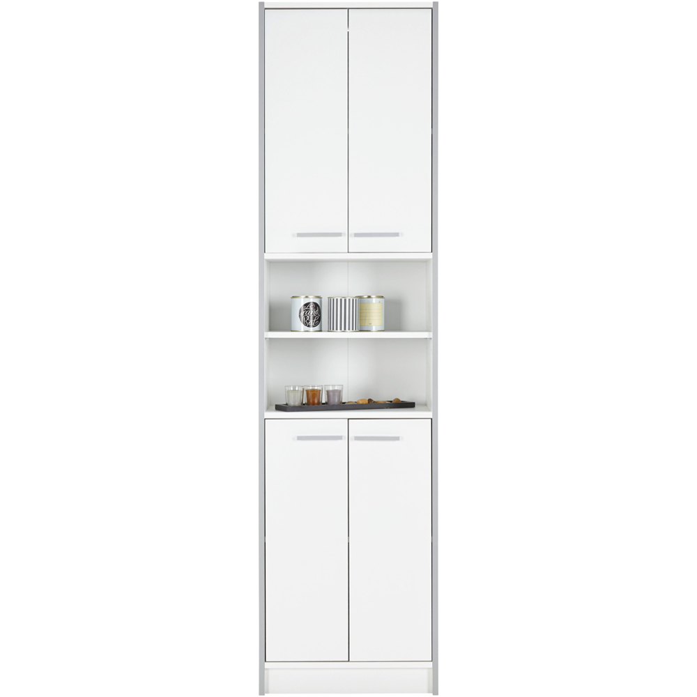 Vysoká skříň perlově bílá, vertikální hrany a lištové úchyty alum.barvy, se 4 dveřmi, 3 vkládacím...