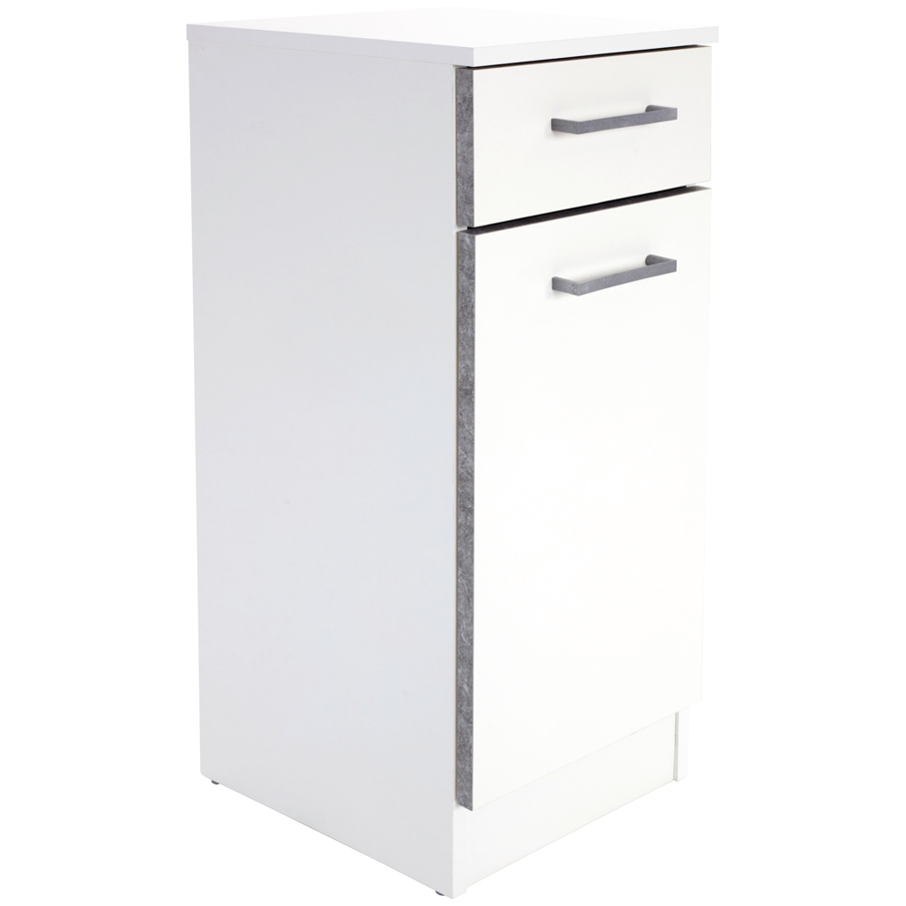 Spodní skříňka, korpus a front v bílém dekoru, ABS hrany v dekoru beton, 1 dveře, 1 zásuvka, úchy...