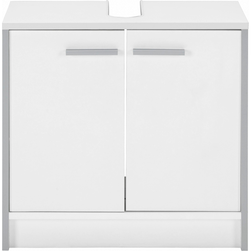 Skříňka pod úmyvadlo, perlově-bílé barvy, se 2 dveřma, s vertikálnyma hranama barvy ALU. Š/V/H: 6...