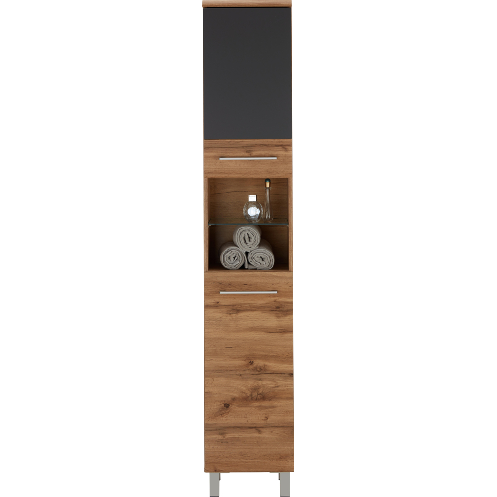 Závěsná koupelnová skříňka vysoká v dekoru jasan o rozměru 25,1x170x32 cm.