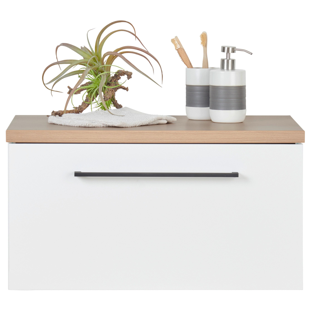 Závěsná deska pod umyvadlo v bílé barvě s lesklým povrchem o rozměru 70x5,4x50 cm. S lakovaným po...