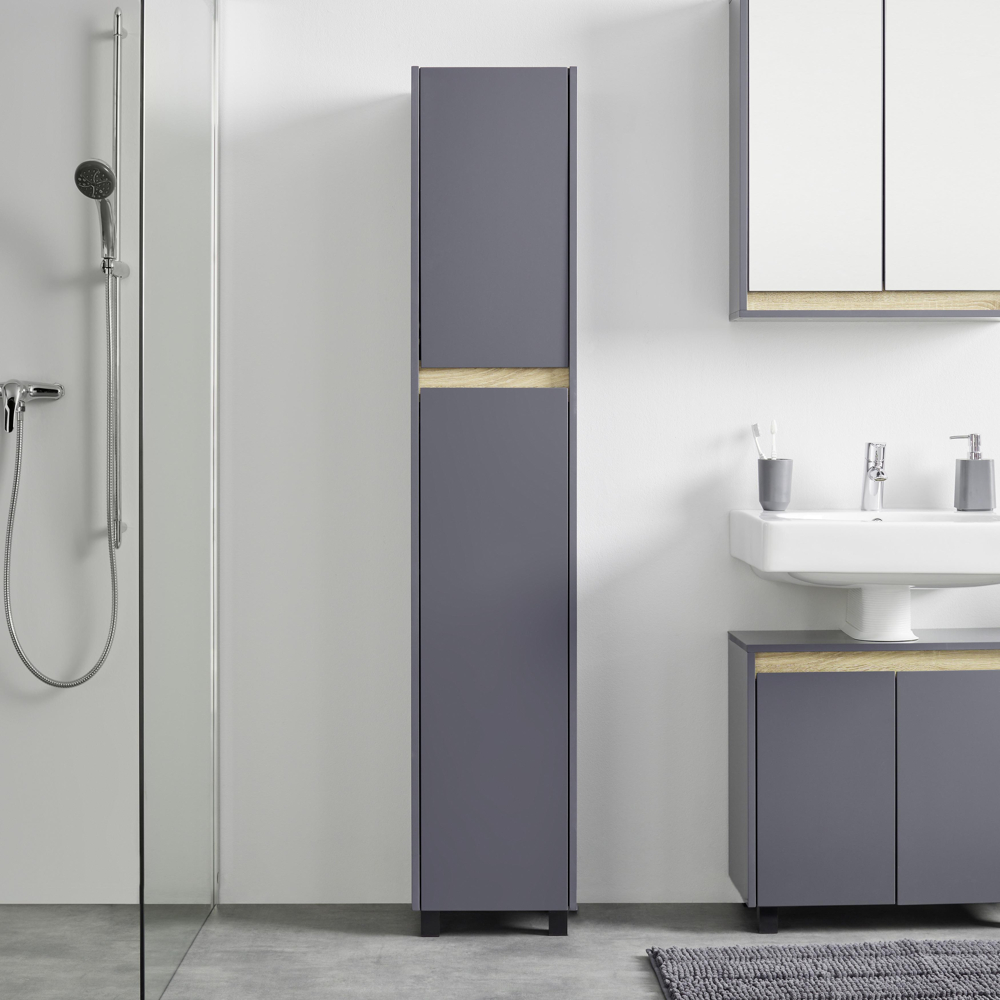 Vysoká skříňka do koupelny se 3 policemi a 2 dveřmi, vybavená bezúchytkovým otevíráním.